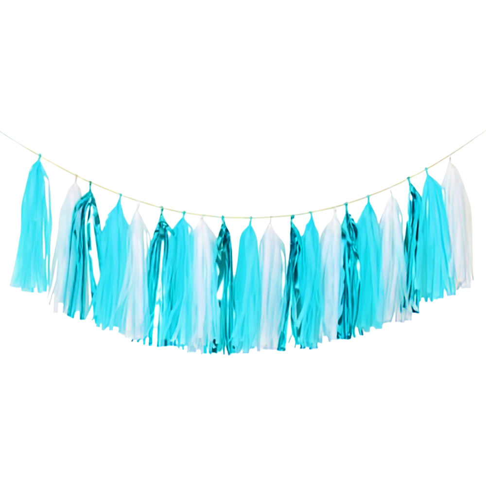 Girlang Tofsar Blå och Vit omfattar en girlang med 20 stycken hängande tofsar i vitt, ljusblått och metallic ljusblått. Tofsarna är ca 36 cm långa och girlangen är ca 250 cm lång. Tillverkad av plast och papp.