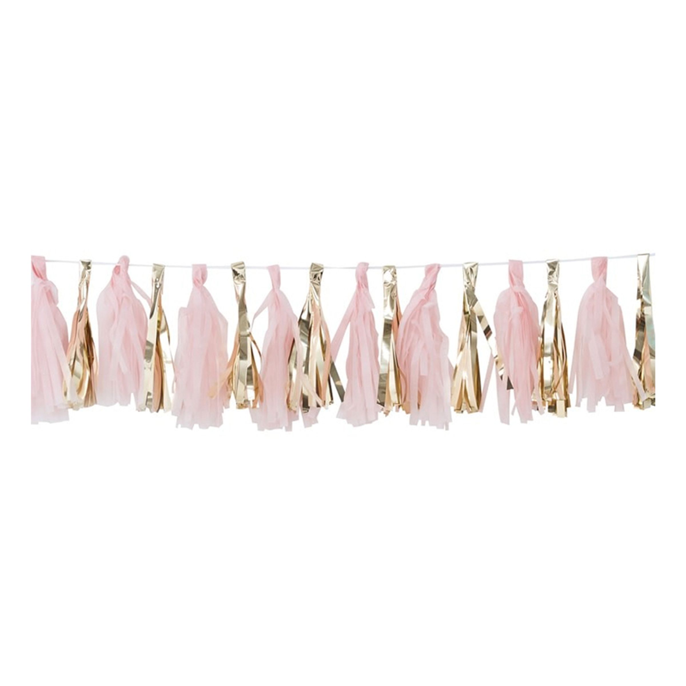 En härlig girlang att dekorera med på ett kalas, en babyshower eller ett dop. De guldfärgade och ljusrosa tofsarna lyser upp rummet och skapar en härlig och mysig kalasstämning. Placera tofsarna precis som du önskar på girlangen och häng upp den i ett fönster, i en dörröppning, över bordet eller på en vägg.