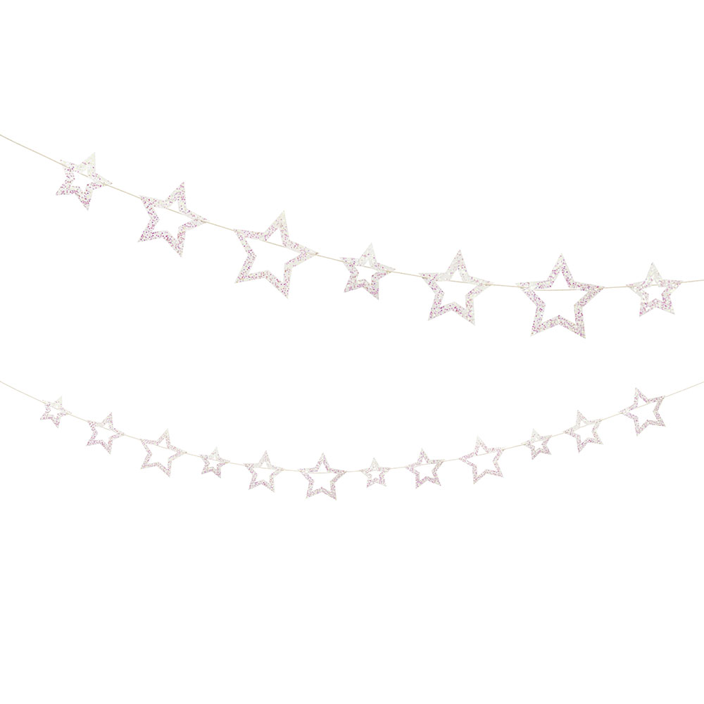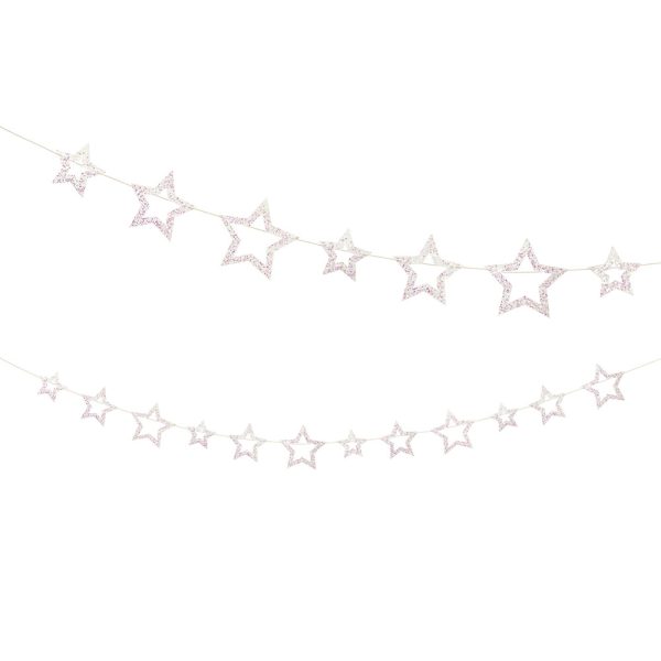 Girlang Vita Stjärnor med Rosa Glitter omfattar en 1.82 meter lång girlang som består av små vita stjärnor med rosa glitter på ett vitt snöre. Stjärnorna är mellan 6 x 6 och 10 x 10 cm stora.
