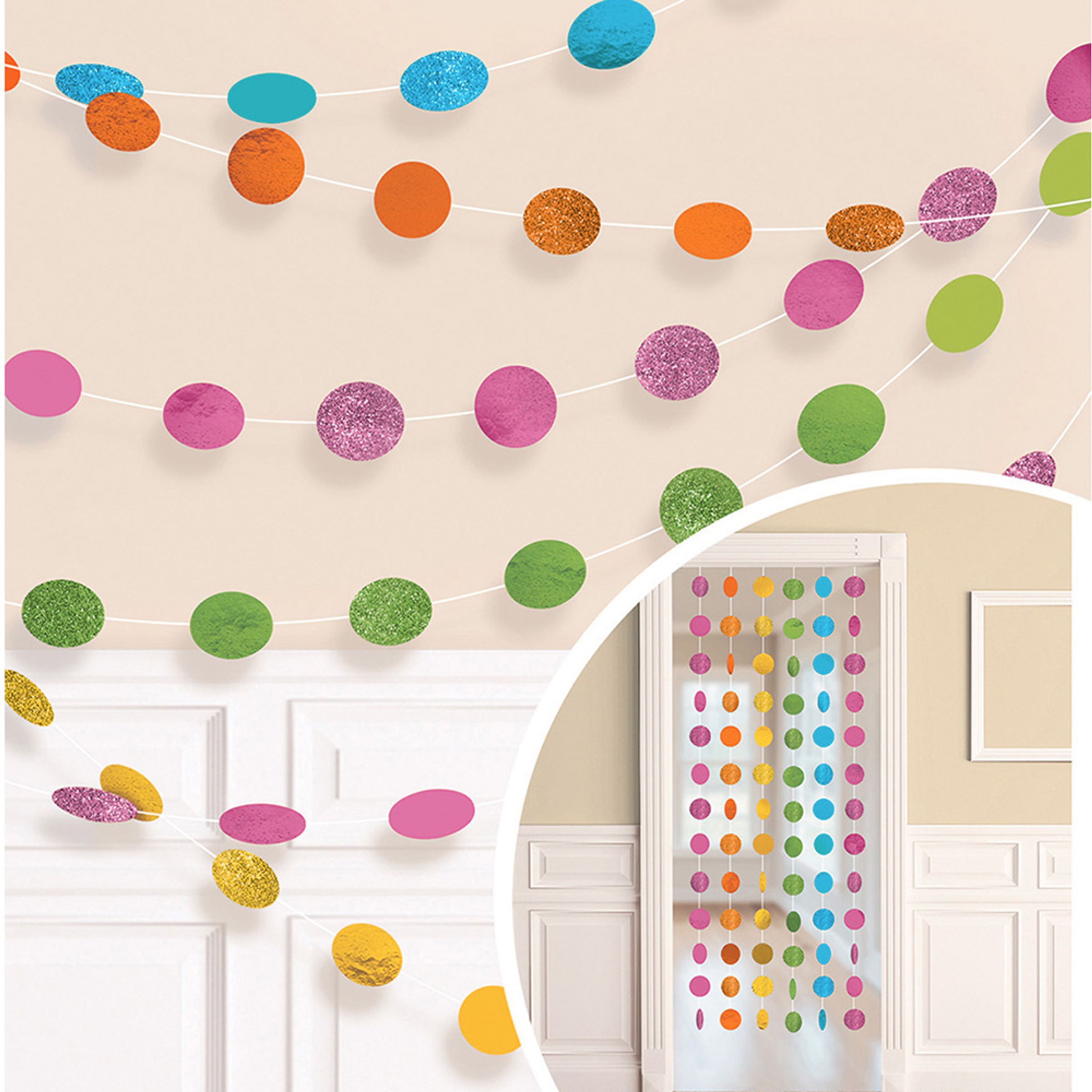 Girlanger Cirklar Flerfärgad Glitter inkluderar sex stycken glittrande girlanger med cirklar i olika färger. Cirklarna är glittrande i rosa, orange, gult, grönt och lila. Girlangerna är tillverkade i folie och är 213 cm långa. Häng upp dem med till exempel egen tejp.