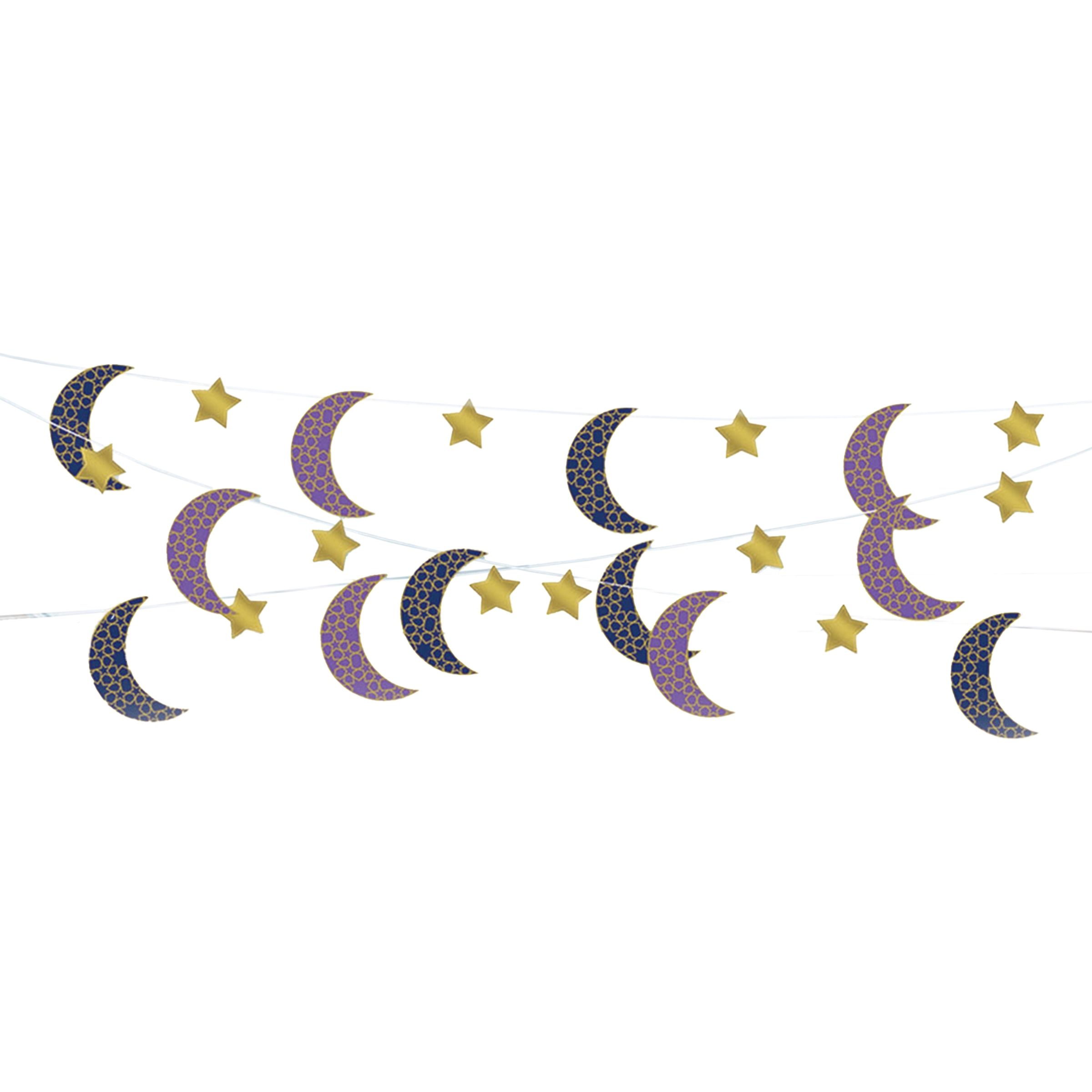 Girlanger Eid Hängande Dekorationer inkluderar sex stycken girlanger med blåa och lila månar och guldfärgade stjärnor. Girlangerna är 213 cm. De är tillverkade i papp och de är enkla att hänga upp med till exempel lite tejp.