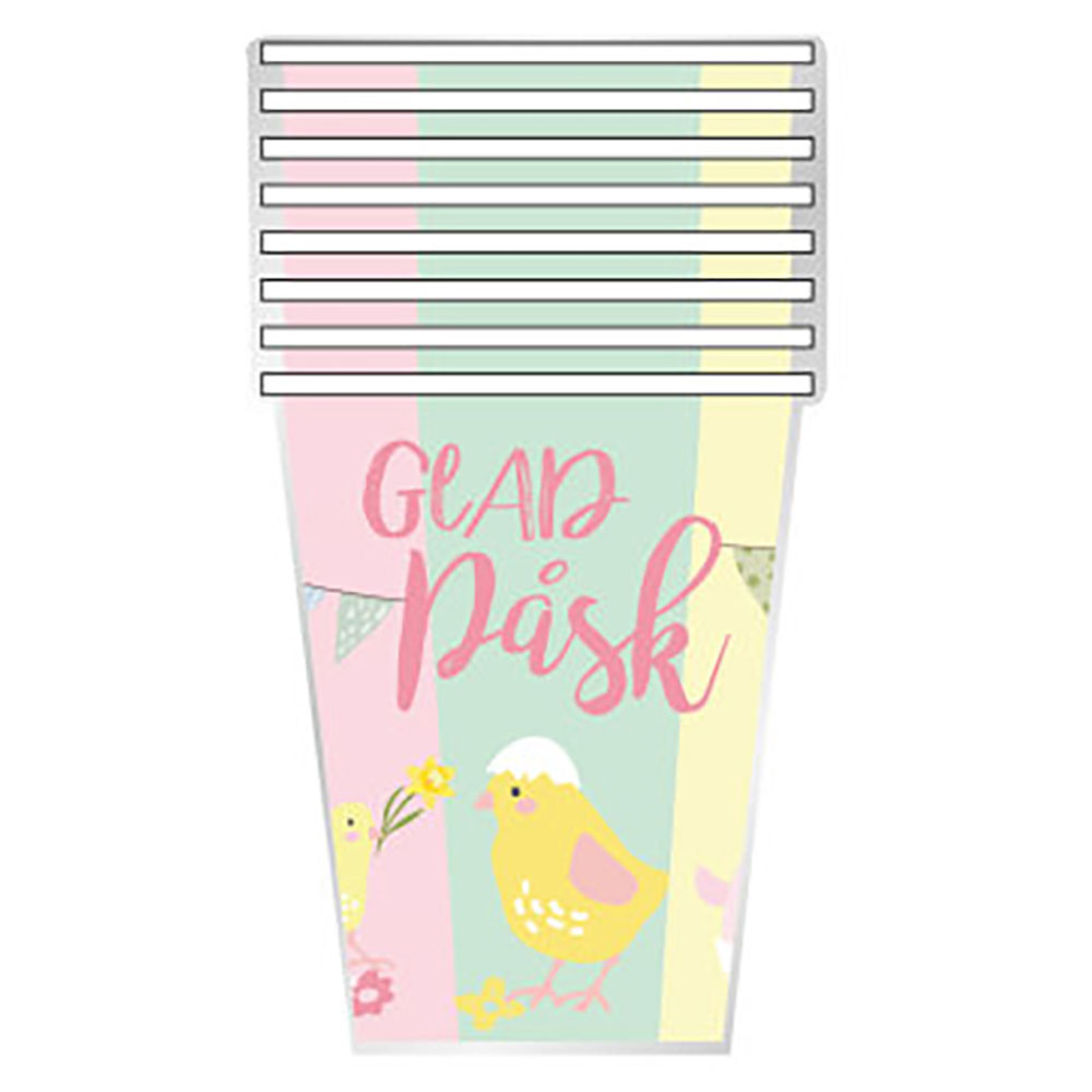 Glad Påsk Muggar innehåller 8 stycken randiga engångsmuggar i ljusgult, ljusrosa och ljusgrönt med motiv av påskkycklingar, flaggirlanger, påskägg och texten "Glas Påsk".