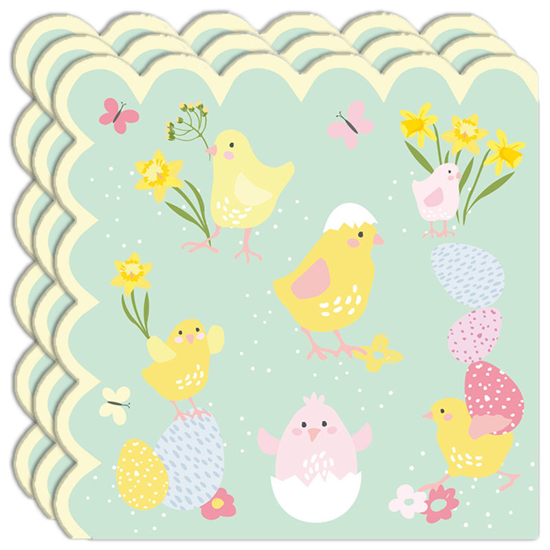 Glad Påsk Servetter innehåller pastell ljusgröna servetter med pastell ljusgul kant samt motiv av påskkycklingar, vårblommor och målande påskägg.