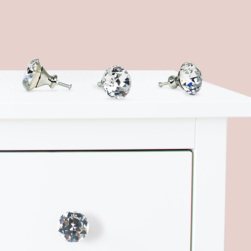 Lyxa till rummet med glamourösa detaljer. Med dessa snygga diamantknoppar i glas förnyar du stilen på en möbel snabbt, enkelt och billigt! Knopparna passar utmärkt på garderobsdörrar, byrålådor och skåp som är max 2,5 cm tjocka. Säljs i ett 4-pack.