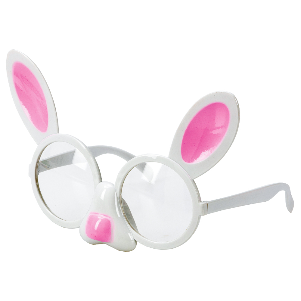 Glasögon Kanin omfattar ett par runda plastglasögon utan glas i vitt och rosa med nos och långa utstående öron. Glasögonen är ca 13 cm höga och 19 cm breda inklusive öron. Passar vuxna.