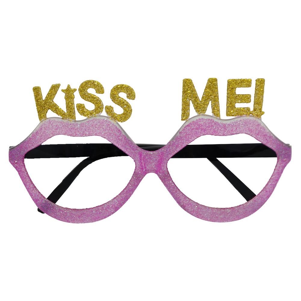 Glasögon Kiss Me omfattar ett par pussmunsformade plastglasögon i rosa glitter med texten "Kiss Me!" i glittrigt guld ovanför samt svarta bågar. Glasögonen är ca 8 cm höga och 15 cm breda.