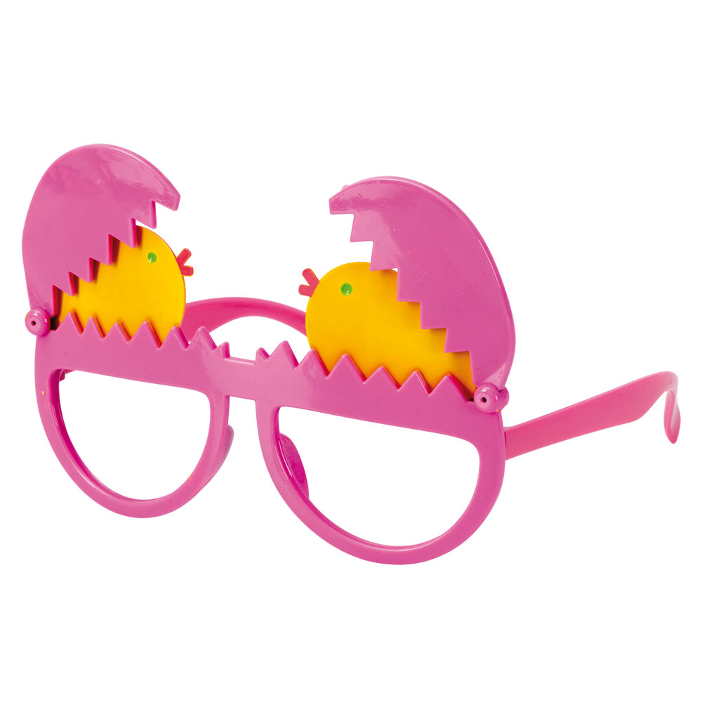 Glasögon Kycklingar innehåller ett par rosa glasögon utan glas med uppstickande ägg och gula kycklingar i. Äggen går att vinklas upp och ned.