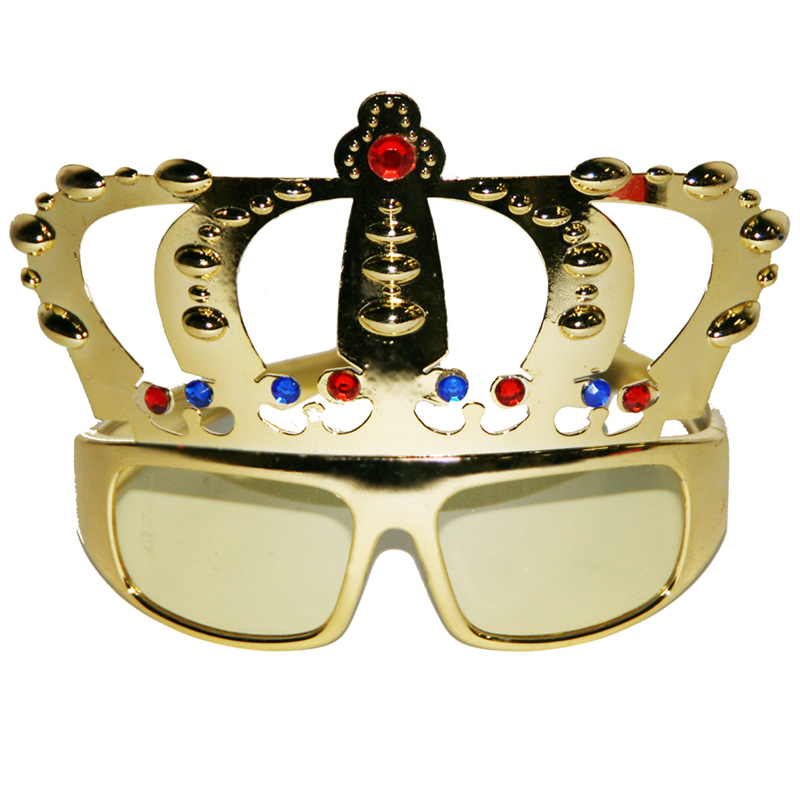 Guldfärgade glasögon som har gula glas samt en fastsatt kungakrona ovantill med röd/blåa smycken.