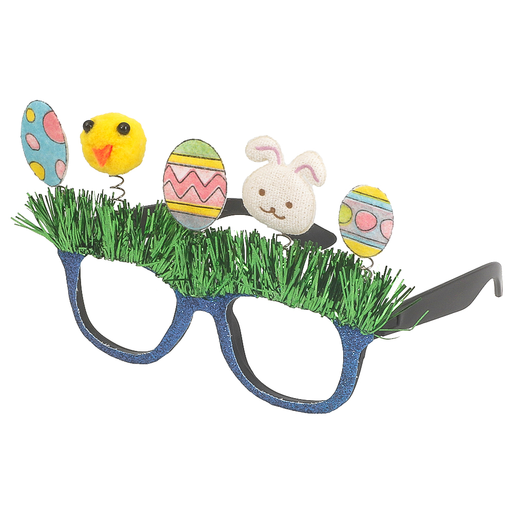 Glasögon Påsk omfattar ett par svarta plastglasögon med blåglittrig framsida med gröna foliefransar och påskmotiv i polyester i form av påskägg, påskkyckling och kanin fastsatta på små spiraler. Glasögonen är ca 10,5 cm höga och 16,5 cm breda inklusive motiv. Vuxenstorlek.