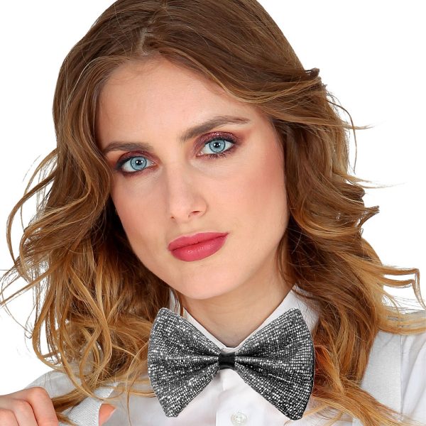 Glitter Fluga Silver omfattar en silverfärgad fluga med ett rutigt mönster som hålls på plats med ett svart resårband.