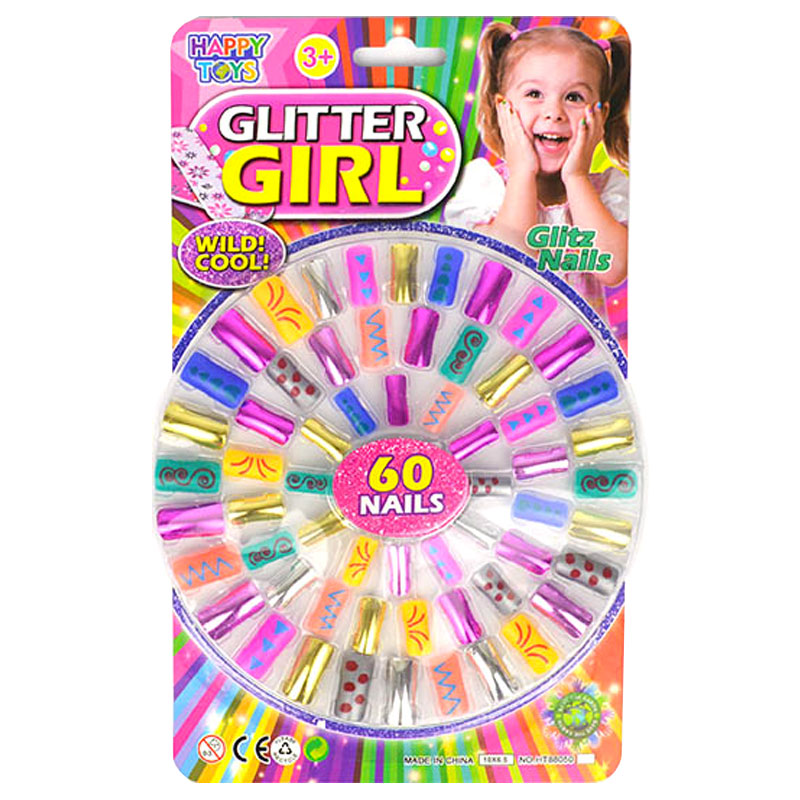 Glitter Girl Lösnaglar Barn omfattar ett set med totalt 60 stycken lösnaglar i flera olika färger, mönster och storlekar. Lösnaglarna är tillverkade av plast och passar barn.