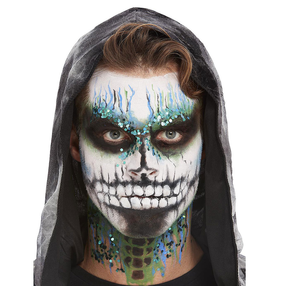 Glitter Skelett Smink Kit Deluxe omfattar ett skelett-smink kit med ansiktsfärger och glitter för vuxna.