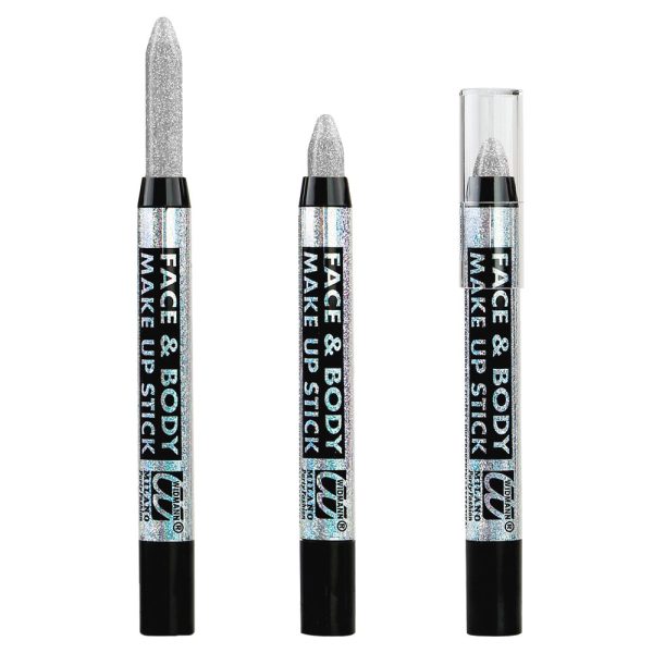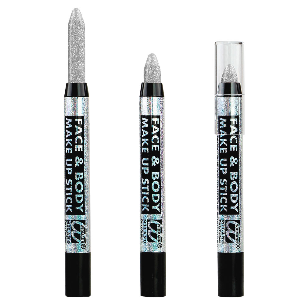 Addera lite silvrigt glitter till ditt halloween eller maskerad smink och få till en riktigt läcker look på nolltid! Med denna praktiska glitter smink-penna kan du snabbt och enkelt sminka dig med glittrande silver. Den lämpar sig till många olika sminkningar och är så gott som ett måste för alla som vill skapa en riktigt iögonfallande sminkning.