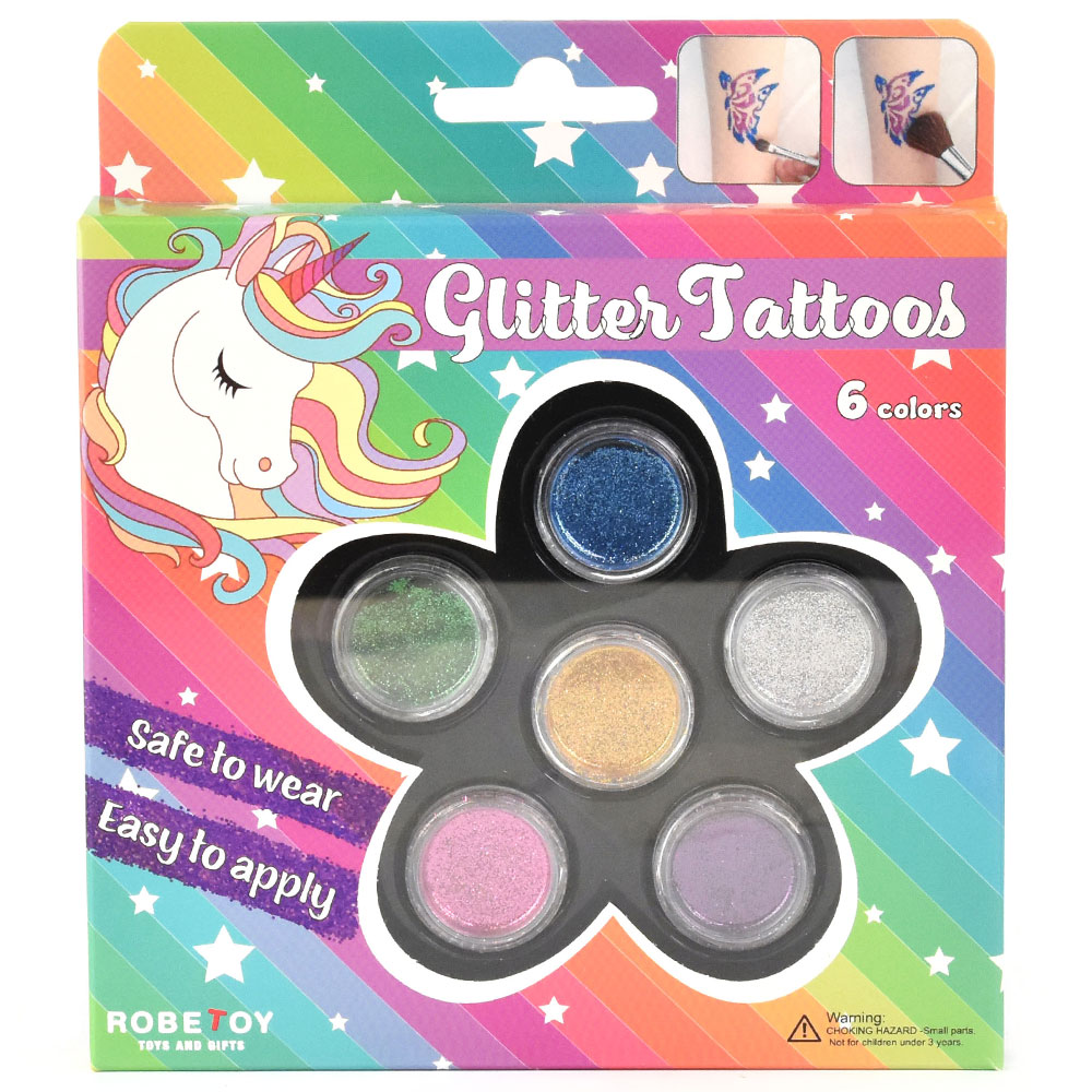 Glitter Tatuering Kit 6 Färger omfattar ett set med tio stensiler, sex burkar fint glitter i färgerna silver, lila, blå, guld, rosa och grönt, samt lim och en borste. Välj en stensil och fäst den på huden, applicera limmet och strö sedan över glitter med borsten.