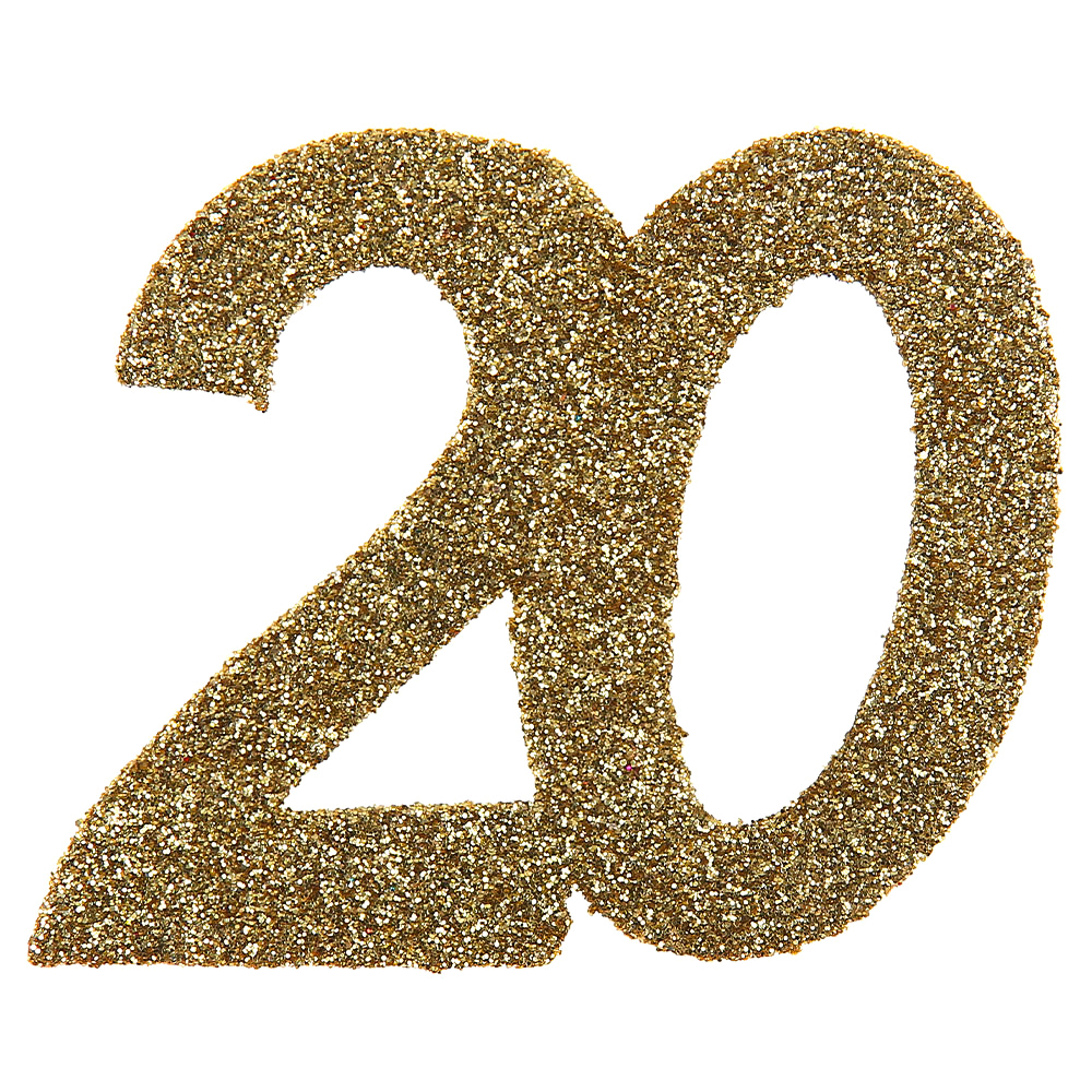 Glitterkonfetti 20 År Guld omfattar 6 stycken 20-års konfetti i glittrande guld. Konfettin är tillverkad av papp och är ca 5 cm lång samt 5,5 cm bred.