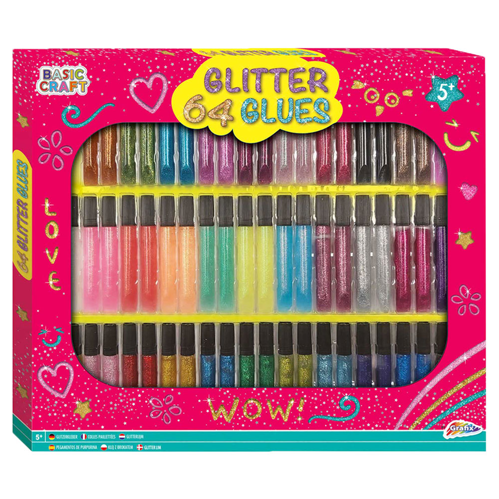 Gör pysslet ännu roligare med detta glitterlim set! Ett rejält set med 64 stycken glitterlim i olika färger som låter kreativiteten flöda fritt. Använd din favoritfärg eller blanda massor av olika färger för ett riktigt färgsprakande pyssel. Superfina glitter-lim som passar perfekt till alla pyssliga barn.