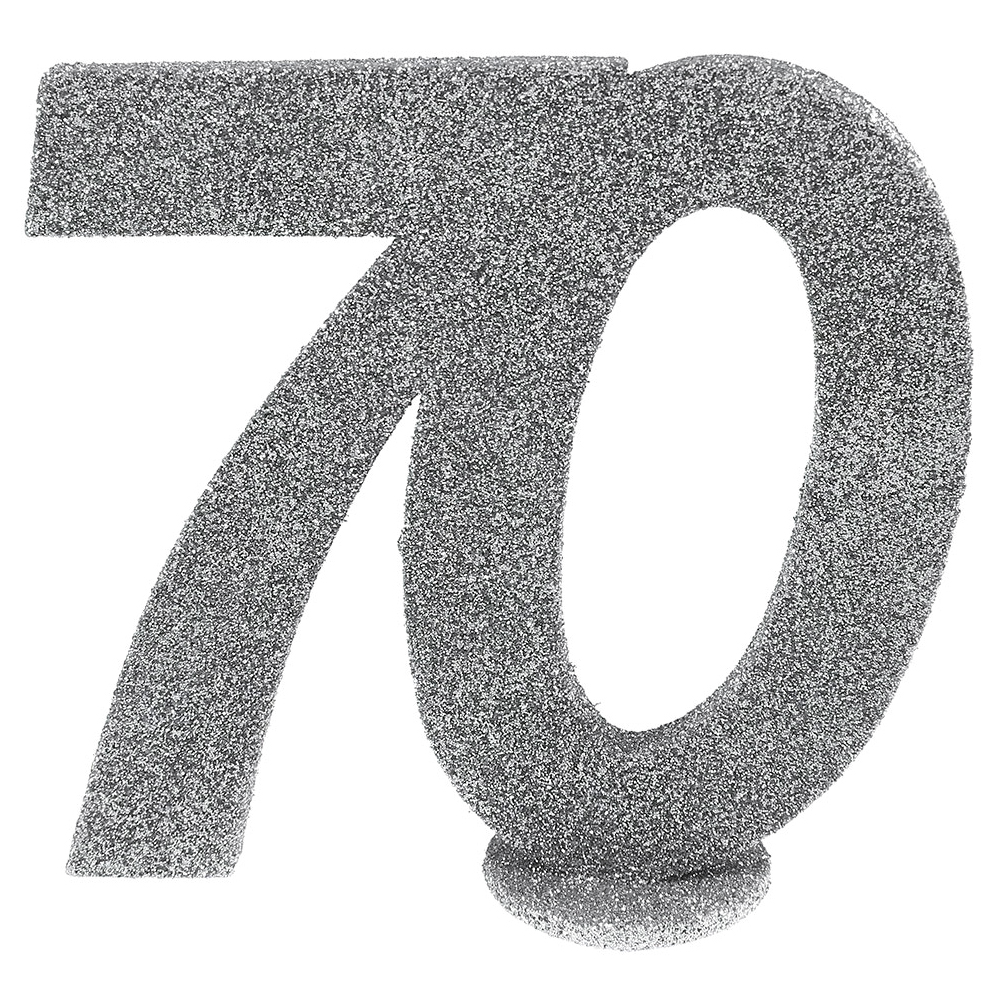 Glittrig 70 Års Dekoration Silver omfattar en stående dekoration i glittrigt silver som föreställer siffran 70. Dekorationen är ca 10 cm hög och 10,5 cm bred. Dekorationen är tillverkad av plast och skummaterial.
