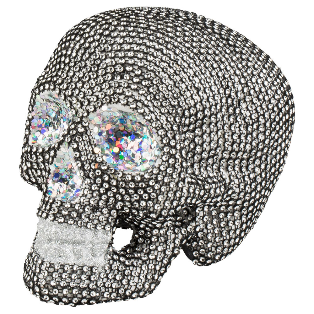Glittrig Döskalle med Diamanter innehåller en döskalle dekoration med silvriga diamanter och glitter. Döskallen är tillverkad av plast och är ca 14 x 17 cm stor.