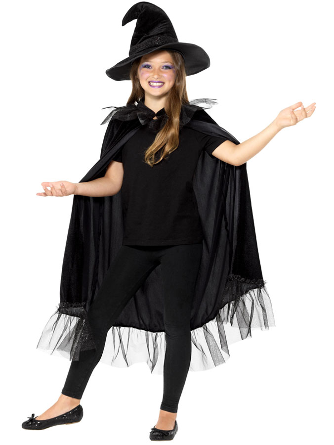 Glittrig Häxhatt & Mantel Barn består av en svart mantel i lent sammets-tyg med silver-glittriga spets detaljer, samt en häxhatt i samma material med silver-glittrigt band.