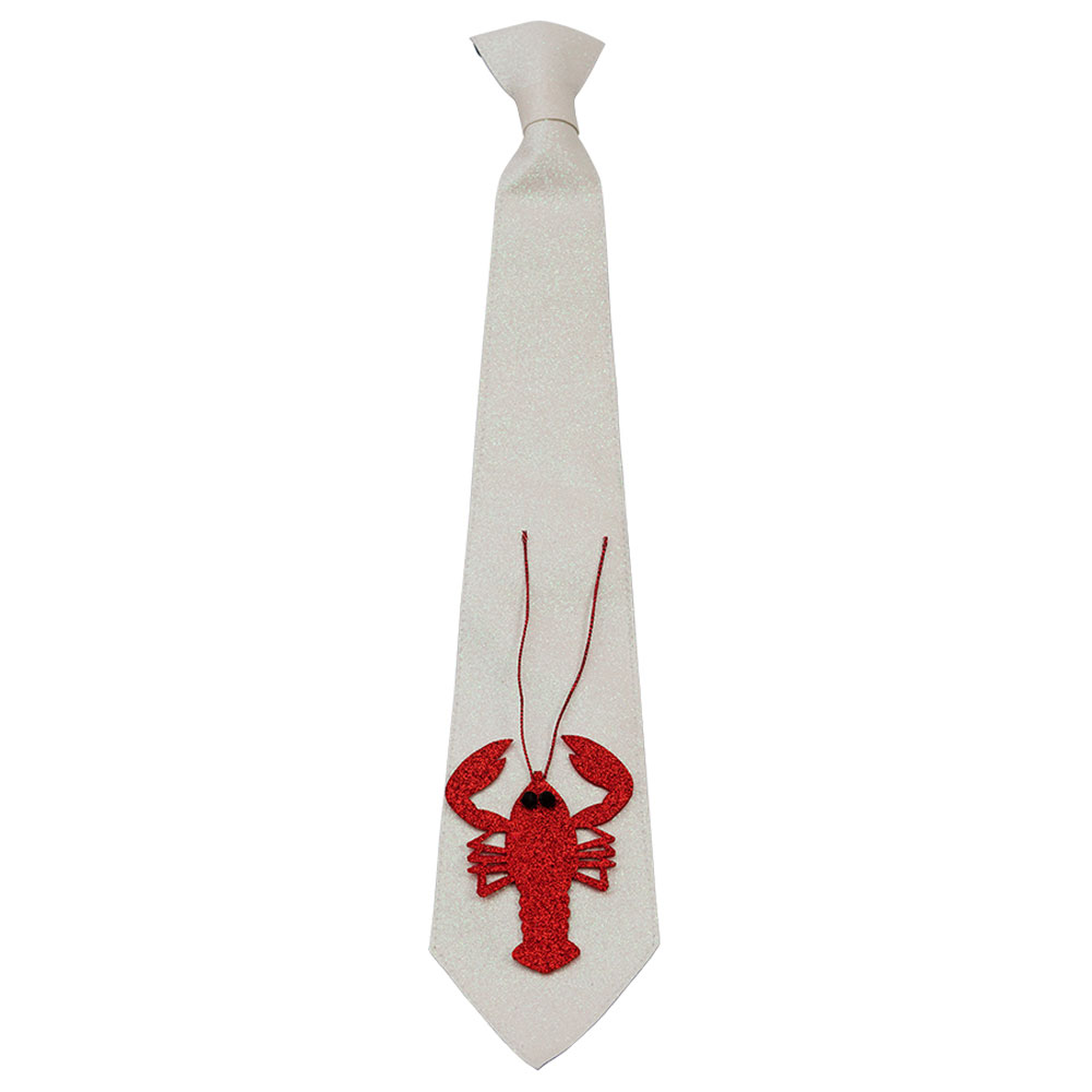 Glittrig Kräftskiva Slips innehåller en vit glittrig slips med en glittrig kräfta på i rött. Slipsen har ett svart elastiskt band som enkelt träs över huvudet.