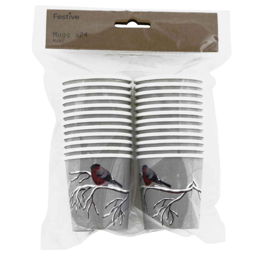 Glöggmuggar Domherre omfattar små pappersmuggar i ljusgrått med motiv av en domherre sittandes på en snötäckt gren. Muggarna är ca 6 cm höga och kan användas till glögg eller annan valfri dryck. Kommer i pack om 24 stycken.