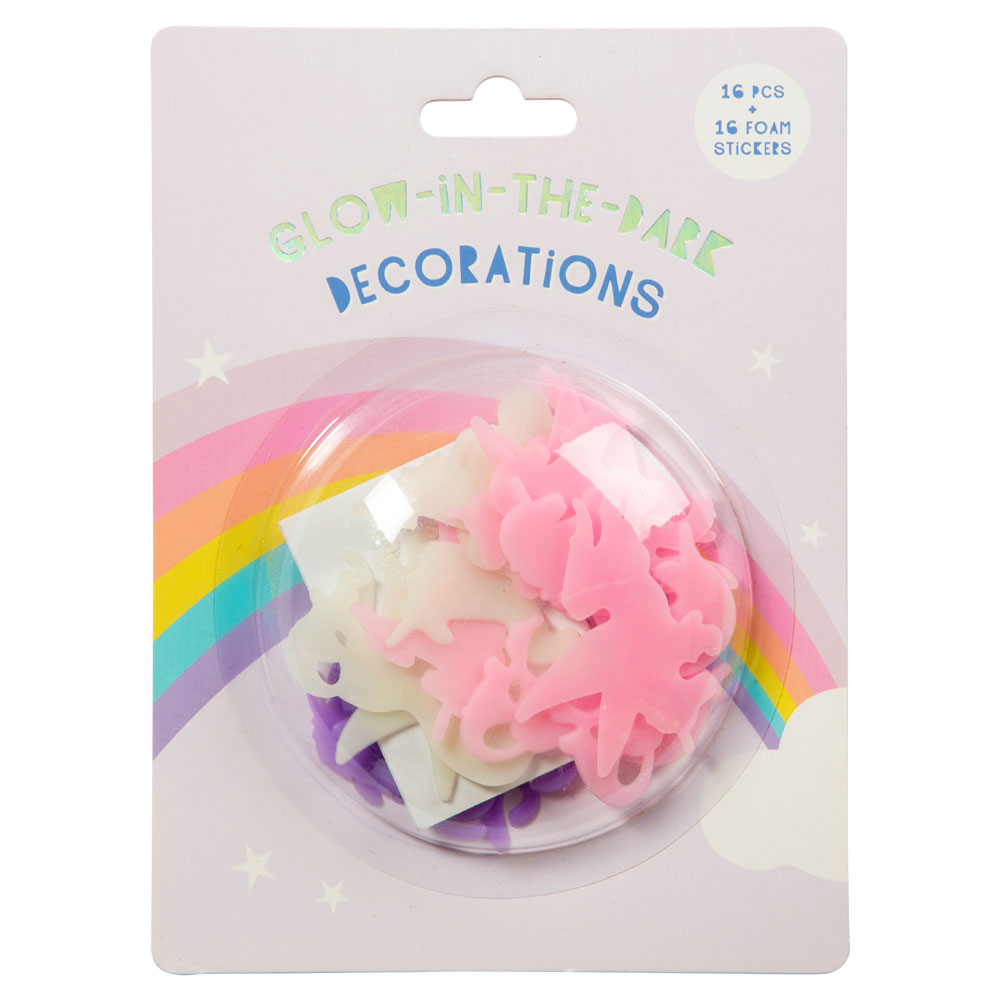 – 16 st självlysande enhörningar i olika färger.