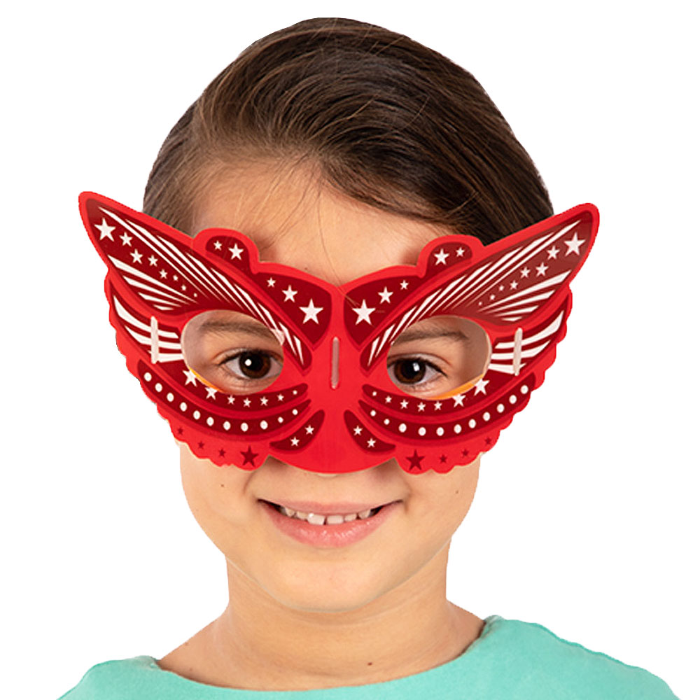 Glow Mask Fjäril Barn Röd omfattar en röd fjärils mask med vingar samt två glowsticks. För att använda masken aktiverar man först ljusstavarna och fäster dem sedan runt ögonen. Ljusstavarna är ogiftiga och lyser i flera timmar. Maskerna kommer med ljusstavar av slumpad färg.