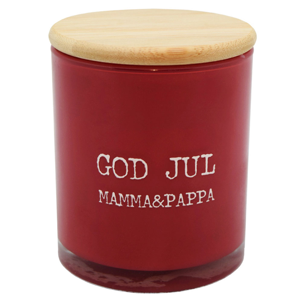 God Jul Mamma & Pappa Ljus består av ett rött glasljus med texten "God Jul Mamma & Pappa" i vitt. Ljuset är doftfritt och har ett trälock.