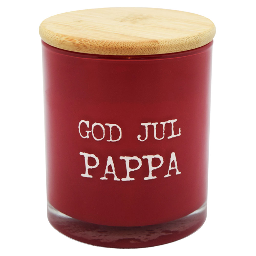 God Jul Pappa Ljus består av ett rött glasljus med texten "God Jul Pappa" i vitt. Ljuset är doftfritt och har även ett fint trälock.