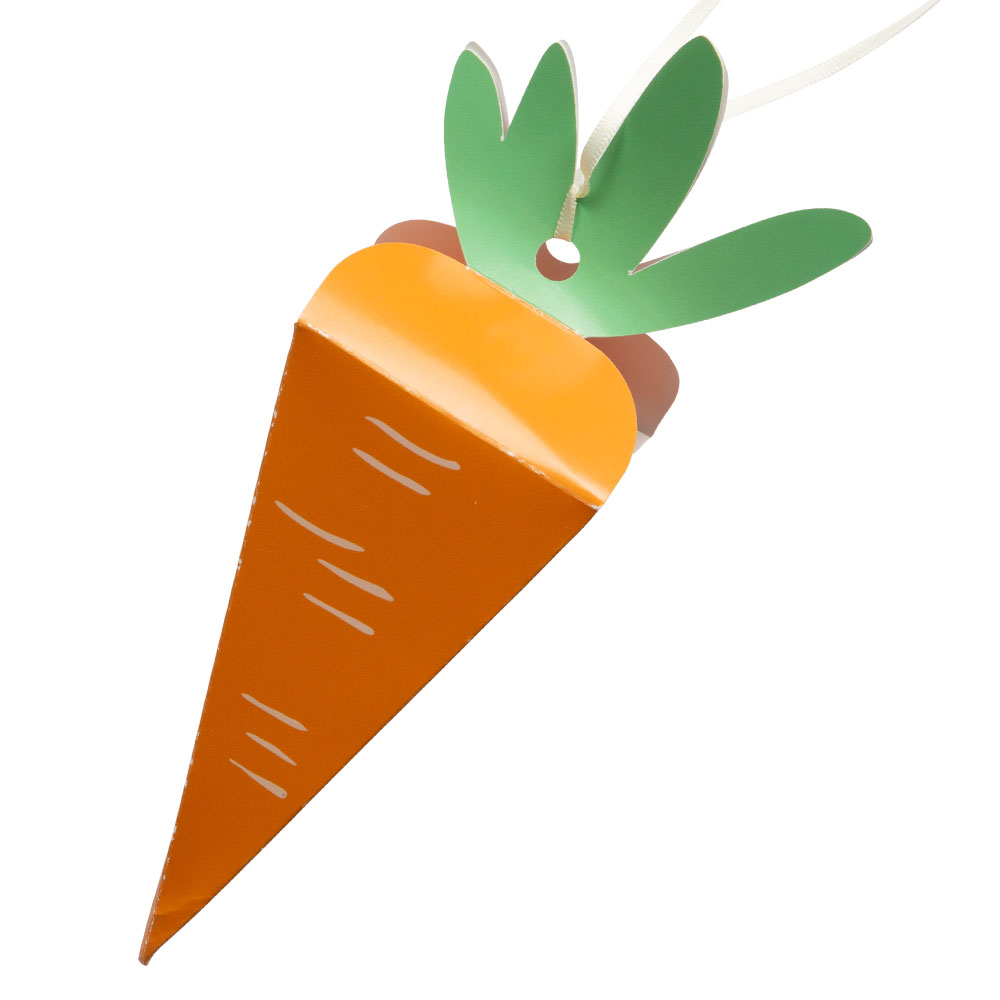 Med de här godisaskarna i form av morötter kommer det synas att påskharen varit på besök. Fyll dem med godis eller kanske små mini-påskpyssel och ge dem till barnen. Perfekt att använda istället för påskägg eller för dig som vill överraska med spännande presentaskar i påskäggsjakten.