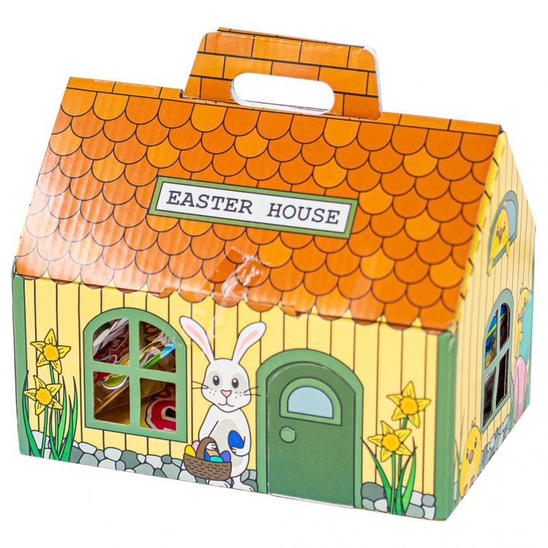 Påsk godishus med 7 olika sorters godis som bland annat colaflaskor, dragéägg och skumgodis.