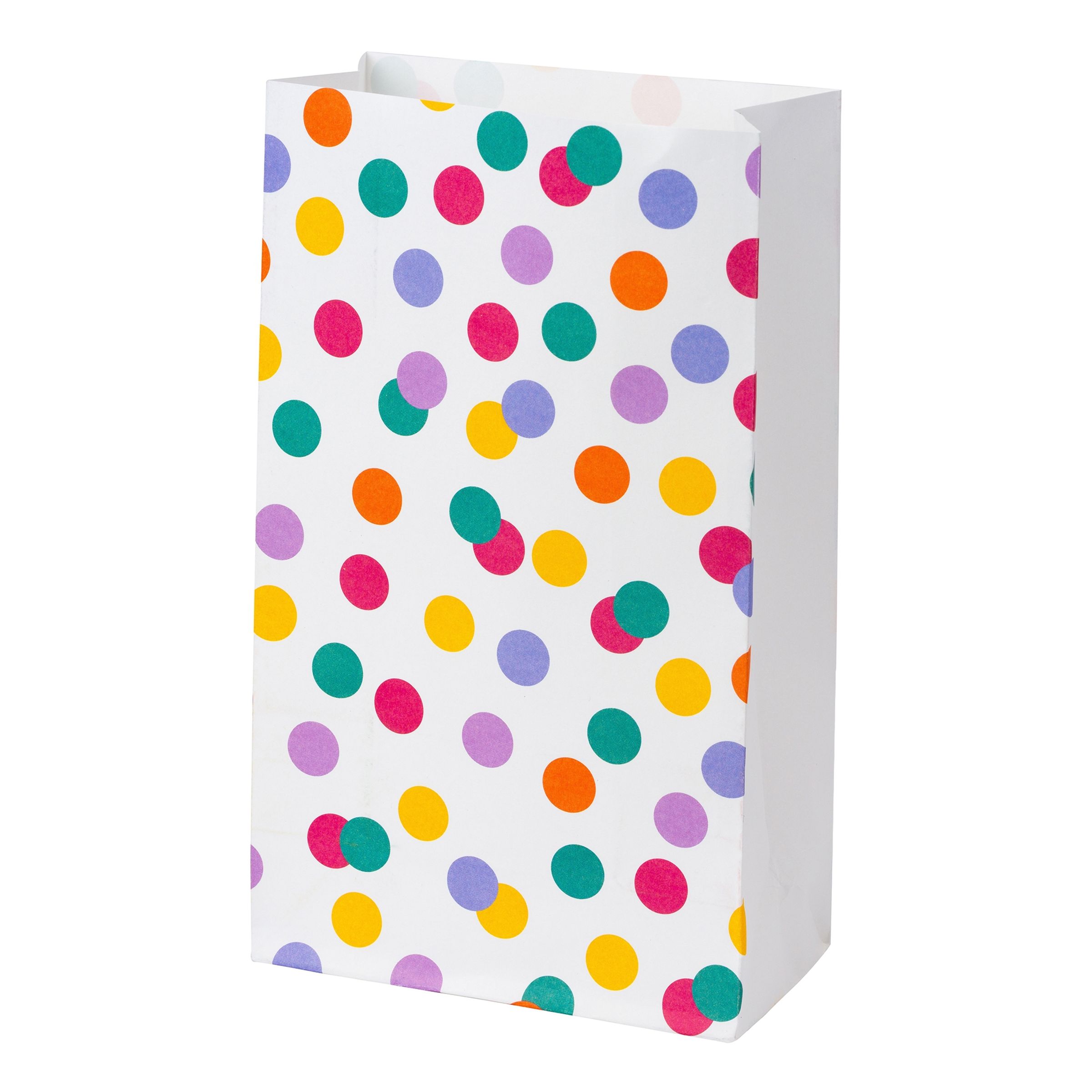 Godispåsar Konfetti inkluderar åtta stycken vita papperspåsar med motiv föreställande rund konfetti i olika färger. Passar utmärkt att matcha med dukning från samma serie för att få till ett komplett tema till kalaset.