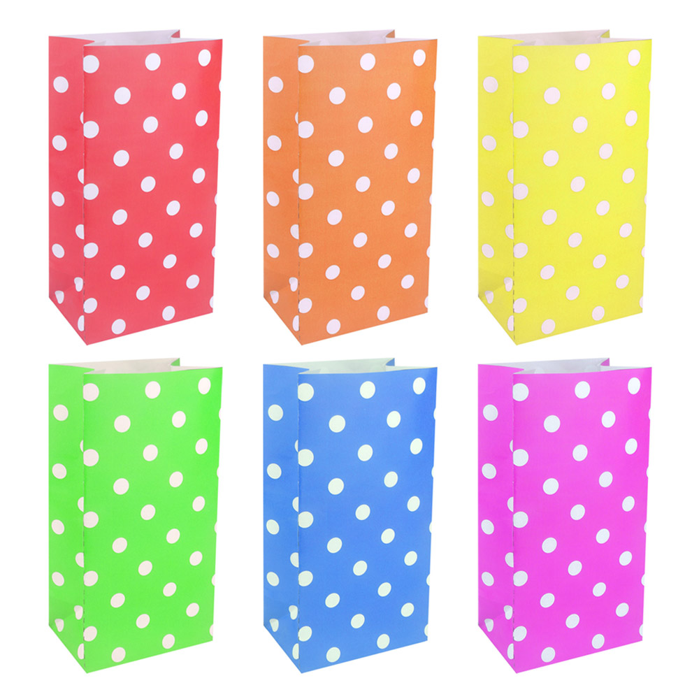 Klassiska godispåsar i polkaprickigt mönster för kalaset. Perfekta kalaspåsar att fylla med godis och små leksaker och dela ut till barnen eller använda i fiskdammen. Kommer i tre olika glada färger och med smiley klister-lappar för att försegla påsarna med.