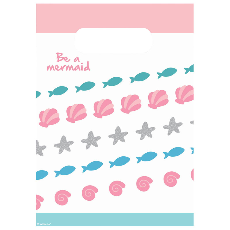 Godispåsar Sjöjungfru består av 8 stycken kalaspåsar i vitt, rosa och pastell blått med små fiskar, snäckor och sjöstjärnor på, samt texten "Be a mermaid" på båda sidor. Påsarna är tillverkade i plast.
