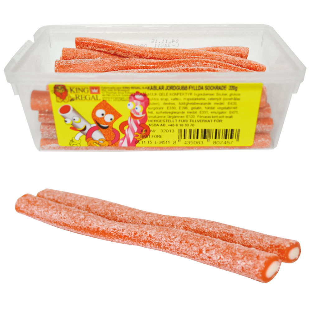Med dessa sockrade godisstänger med smak av somriga jordgubbar är lördagskvällen räddad! Klassiska godis kablar som är en stor favorit hos både barn och vuxna. Ta ett djupdyk ner i godispåsen och ät så många jordgubbs-godisstänger du orkar!