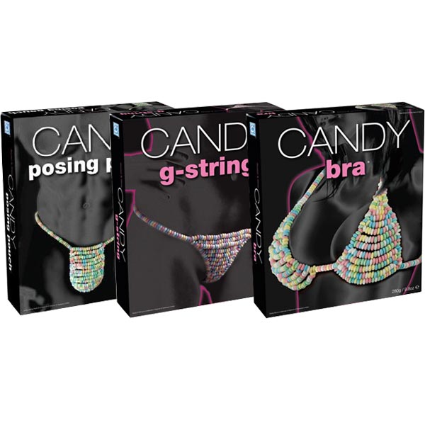 Godisunderkläder omfattar ätbara underkläder med färgglatt godis. Välj mellan kalsong, trosa och bh.