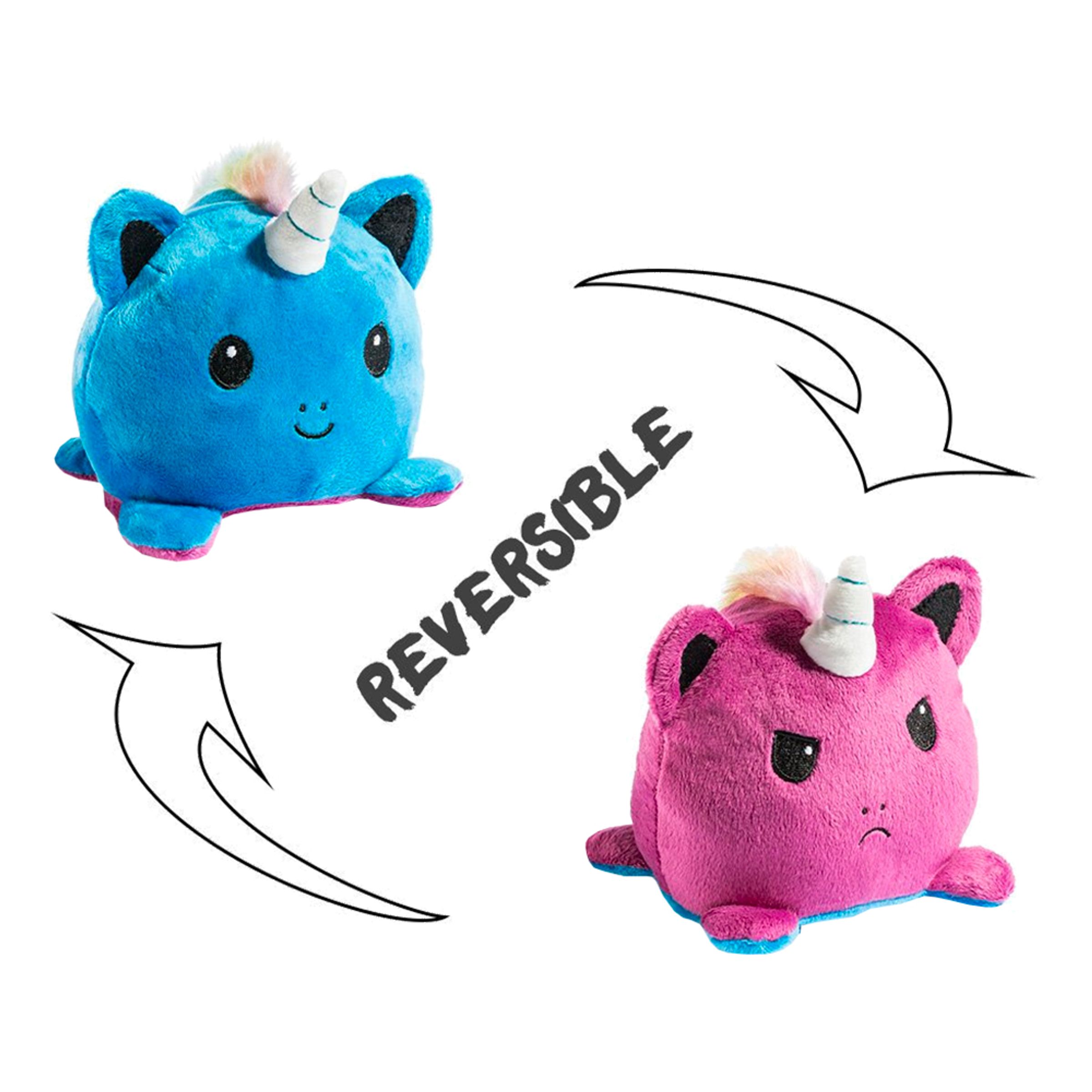 Gosedjur Enhörning Glad/Sur Vändbar är ett gosedjur format som en enhörning. På ena sidan har enhörningen ett glatt ansikte i blå färg och på den andra sidan ett surt ansikte i rosa färg. Du kan alltså bestämma hur enhörningen ska se ut. Gosedjuret är tillverkat i plysch, är ca 13 x 10,5 x 12 cm och säljs i 1-pack.