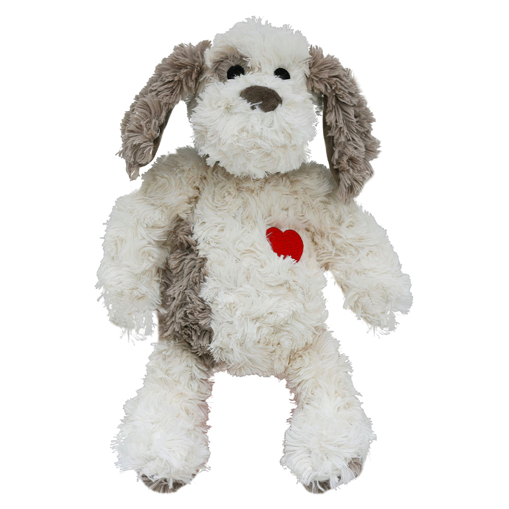 Gosedjur Hund med Broderat Hjärta omfattar en gosedjurshund i 100 % polyester med fluffig vit och grå päls, långa öron, grått hundhalsband samt motiv av ett broderat hjärta i rött på magen. Hunden är ca 32 cm hög.