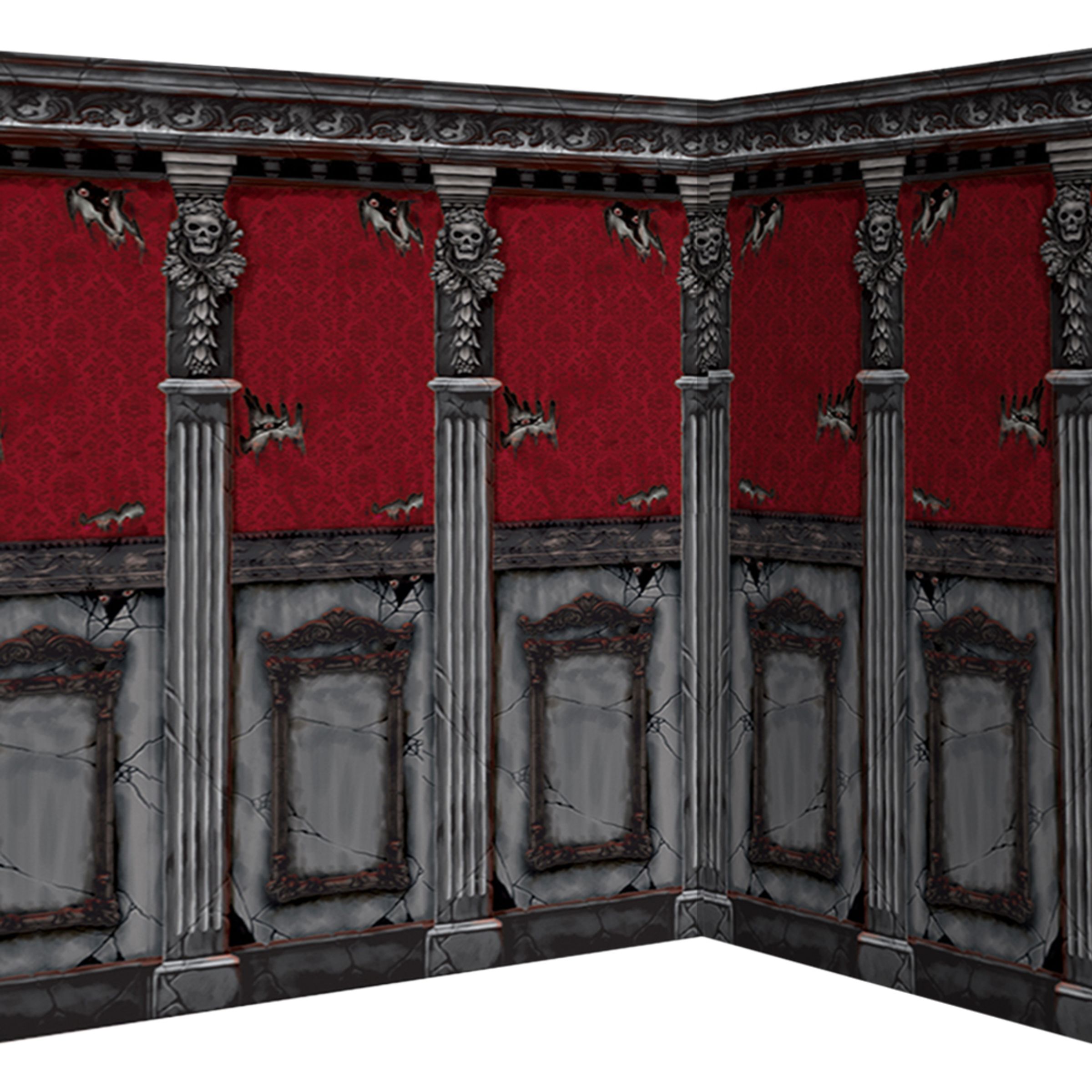 Gothic Mansion Väggdekoration föreställer ett rum med blodsröda väggar. Fästes med tejp eller liknande och kan användas både inomhus och utomhus. Två ark medföljer som ihop mäter hela 6 meter bred, vilket ger ett effektfullt intryck!