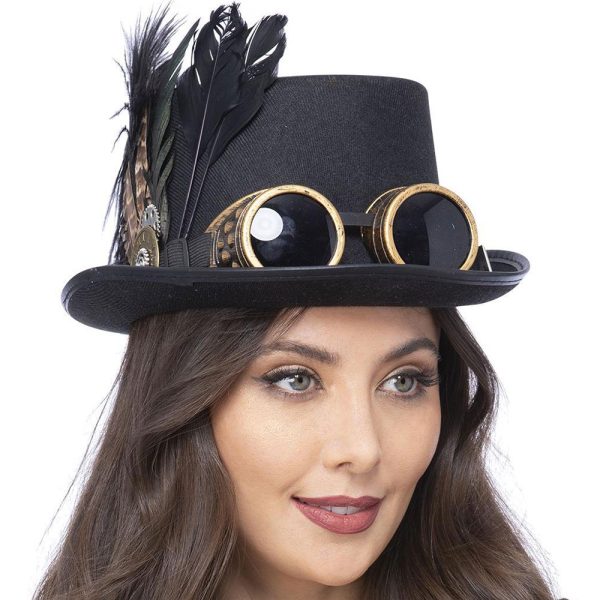 Gothic Viktoriansk Steampunk Hög Hatt omfattar en svart hög hatt med ett par steampunk glasögon, kugghjul dekoration och fjädrar.