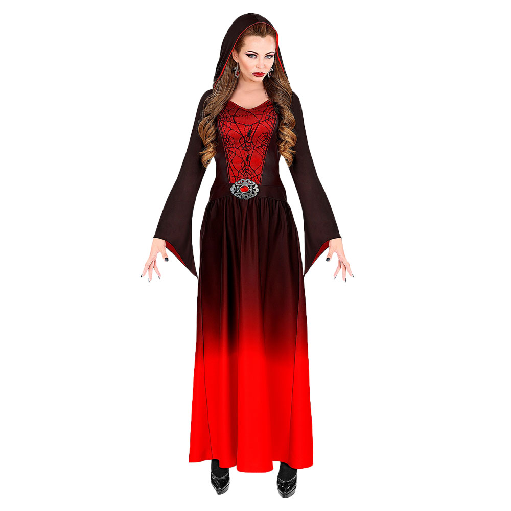 Röd och svart vampyr-dräkt som blir perfekt för dig som söker en gotisk maskerad utklädnad. Med en lång klänning med huva och snyggt spindelnäts motiv får du enkelt till din vampyr kostym på nolltid. Superfin vampyr halloween klänning för alla vampyrer som vill känna sig riktigt festfina!