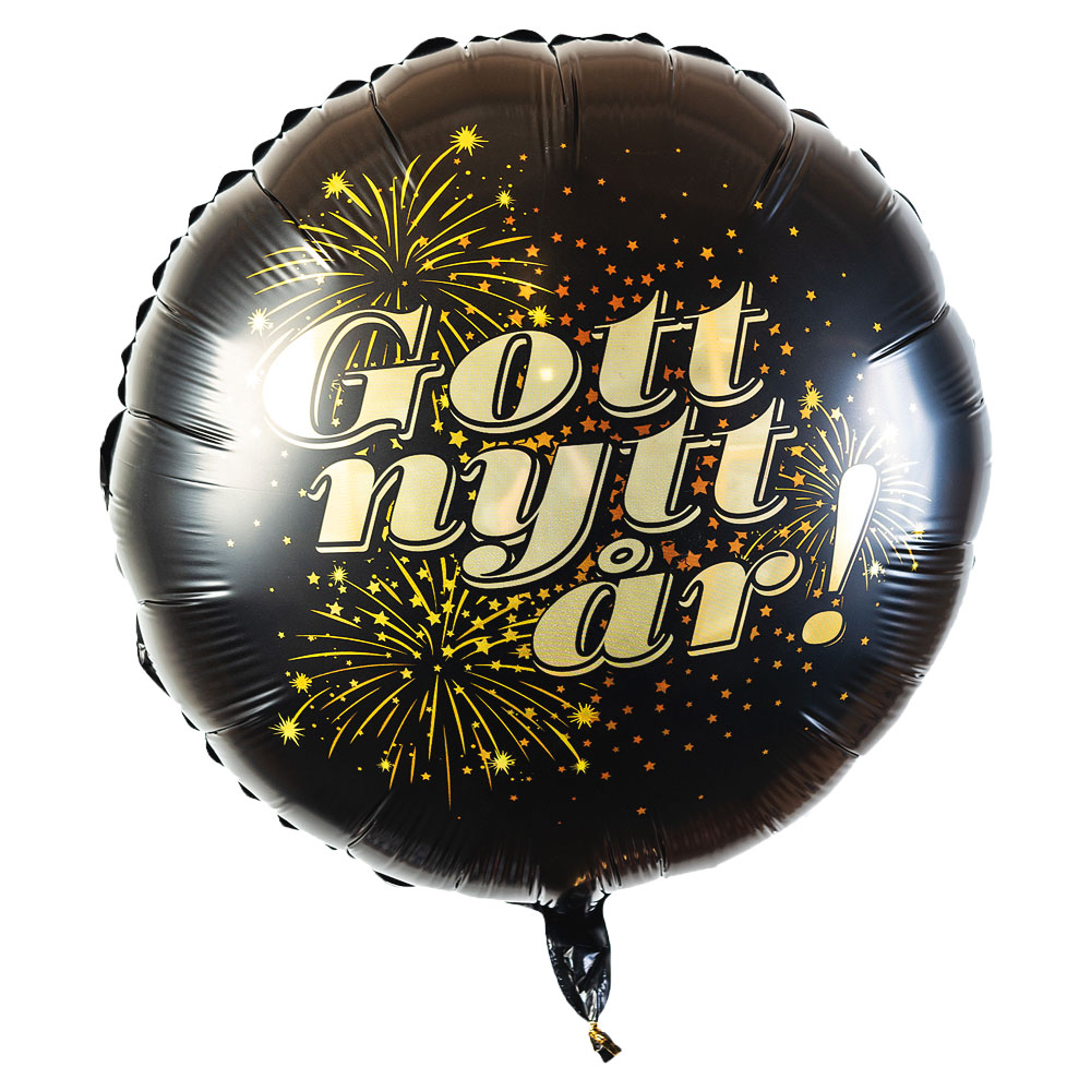 Gott Nytt År Folieballong Svart & Guld omfattar en lite större folieballong i svart med texten "Gott nytt år!" i guld med motiv av fyrverkerier i guld och koppar. Ballongen fylls med helium eller luft och blir ca 53 cm stor. Ballongen rymmer ca 24 liter och har självförslutande ventil.