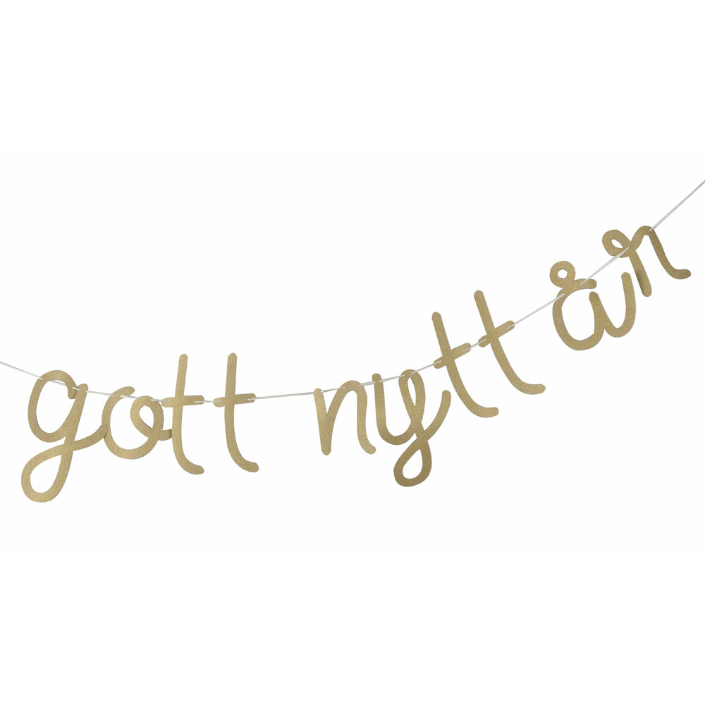 Gott Nytt År Girlang omfattar en glittrig girlang i guld med texten "Gott Nytt År". Girlangen är ca 4 meter lång och är tillverkad av papp.