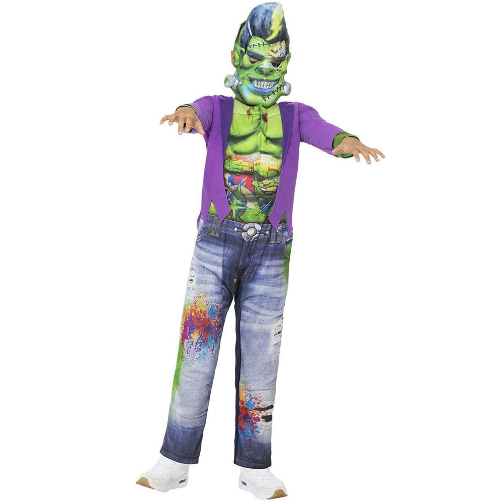 Graffiti Frankenstein Dräkt Barn omfattar en detaljerad jumpsuit som föreställer frankensteins monster iklädd jeans och en lila kavaj. Kavajens överarmar är vadderade och är öppen över bröstkorgen som är vadderad och har ett graffitimönster. Mask i EVA-plast ingår som föreställer ett grönt frankensteins monster ansikte med graffitimönster som täcker ansiktet och hålls på plats med resårband.