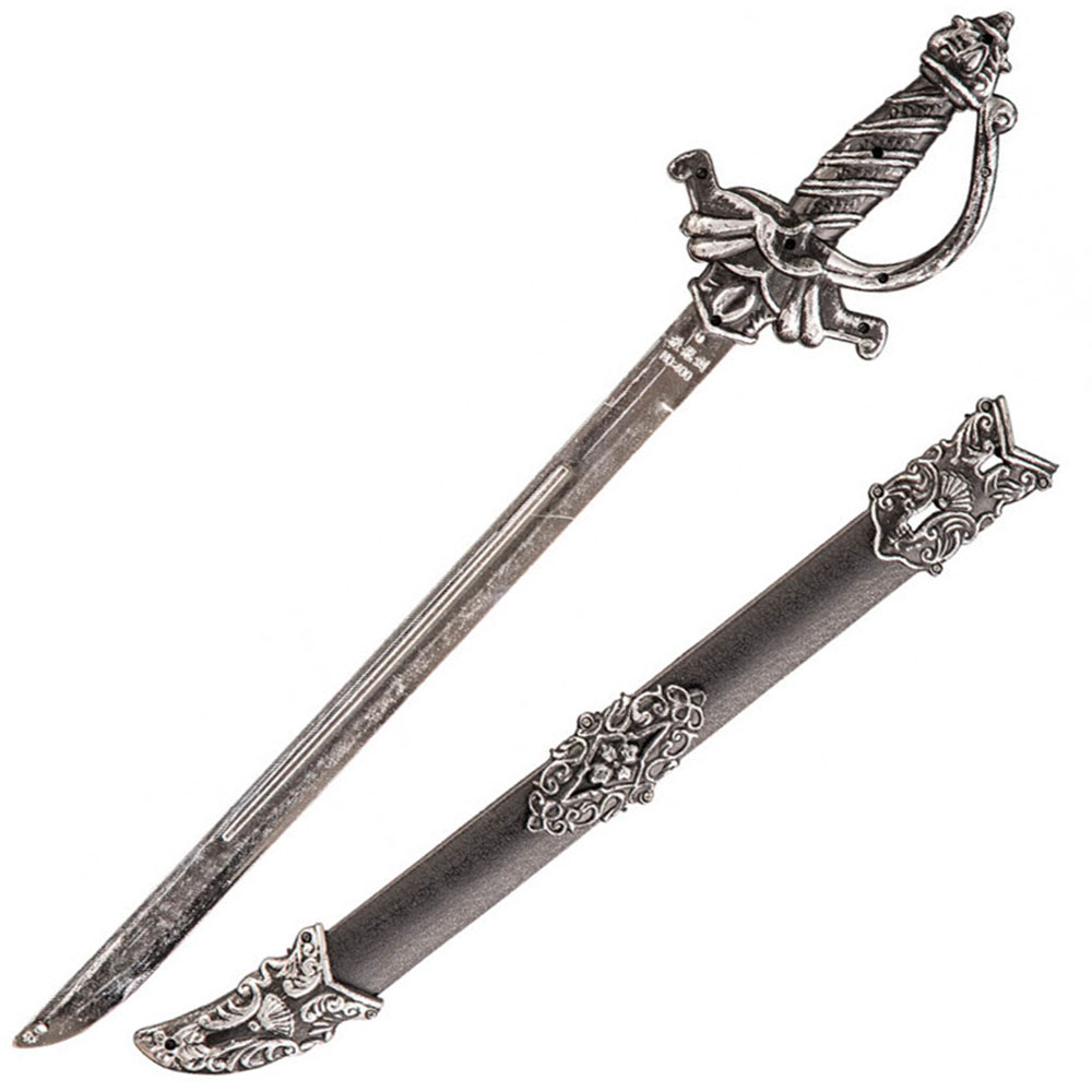Grått Svärd med Skida omfattar ett svärd i svart, grått och silver med en svart, silver och detaljerad skida.