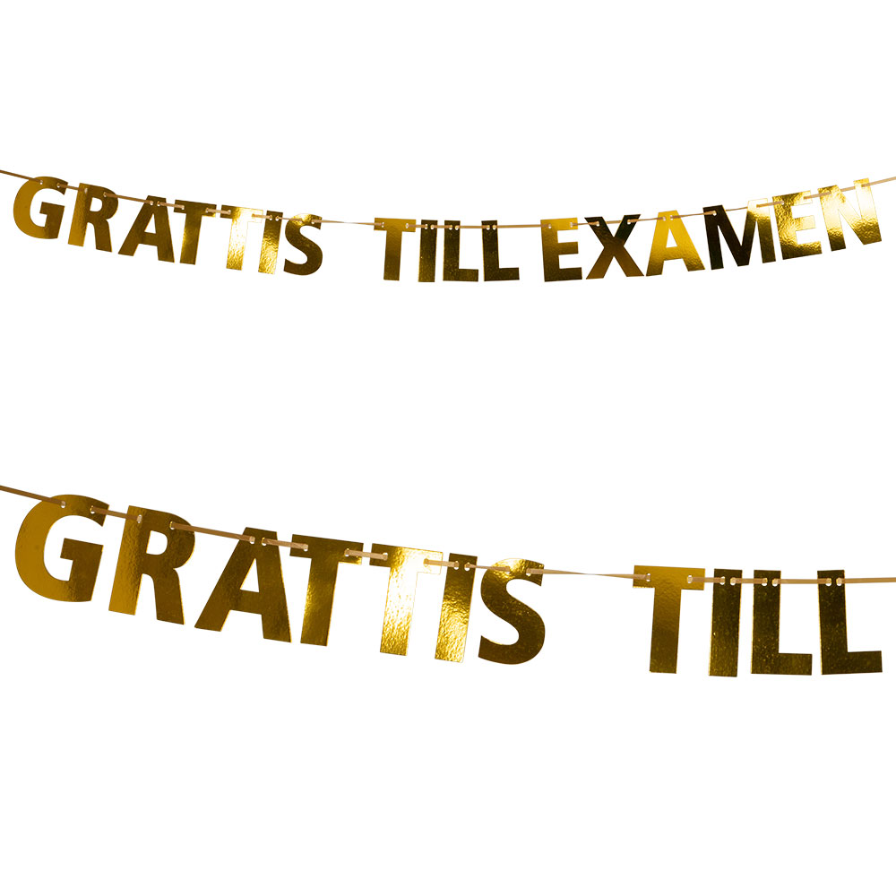 Grattis Till Examen Girlang Guld omfattar en guldig girlang med texten "Grattis till examen". Girlangen är tillverkad i papp och är ca 15 cm hög samt 360 cm lång.