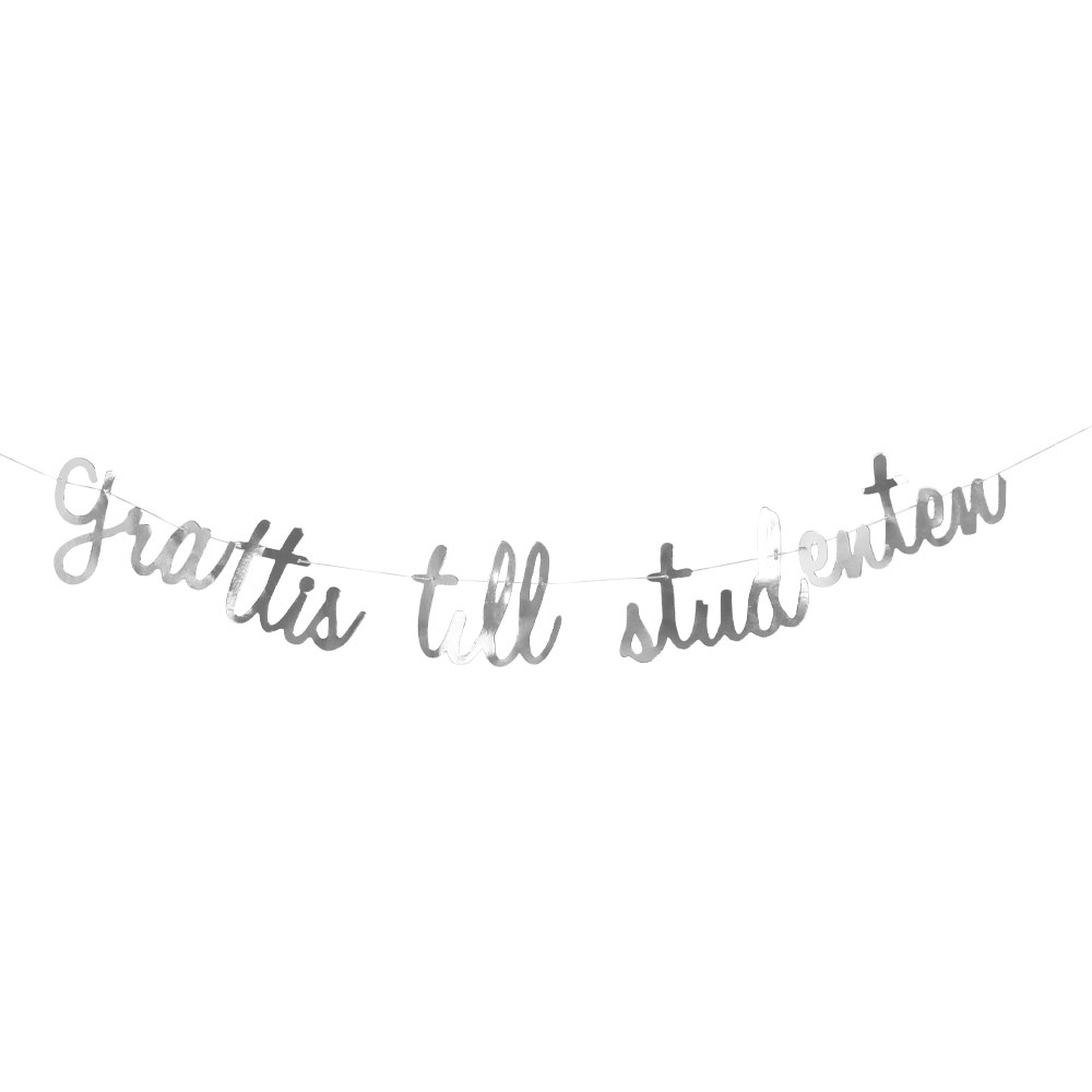 Grattis Till Studenten Girlang Silver omfattar en silvrig girlang med texten "Grattis Till Studenten". Girlangen är tillverkad av papp och är ca 20 cm hög samt 210 cm lång.