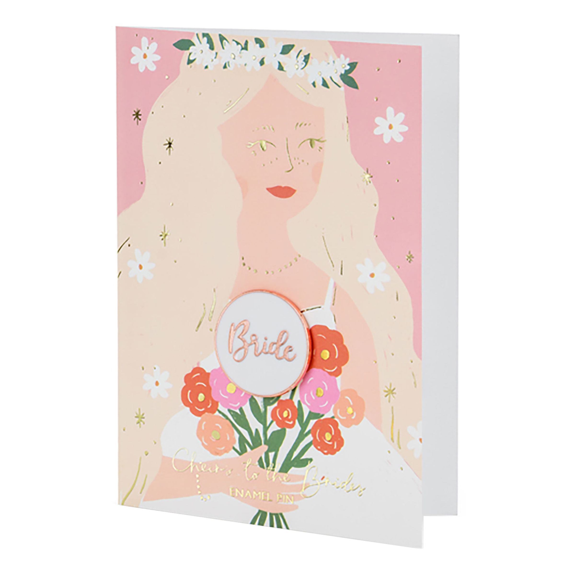 Gratulationskort med Pin Bride är ett gratulationskort med texten "Cheers to the bride" skrivet i guld att ge till bruden. Med kortet levereras ett passande vitt kuvert med gulddetaljer och en pin, eller emaljstift, med texten "Bride" att sticka fast i tröjan/klänningen. Passar utmärkt till bröllopsfesten!
