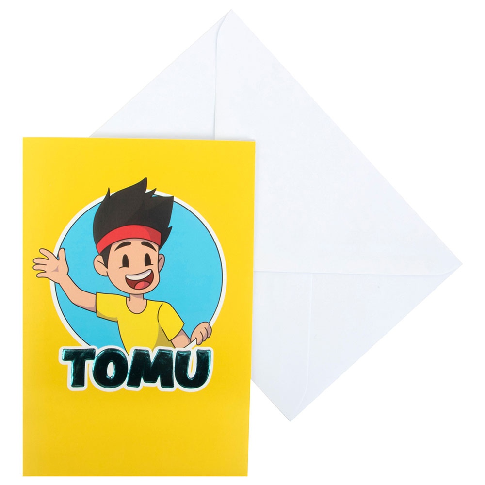 Gratulationskort Tomu omfattar ett vitt gratulationskort med en gul framsida med en turkos cirkel med motiv av Tomu som vinkar samt texten "Tomu". Kommer i ett kuvert.