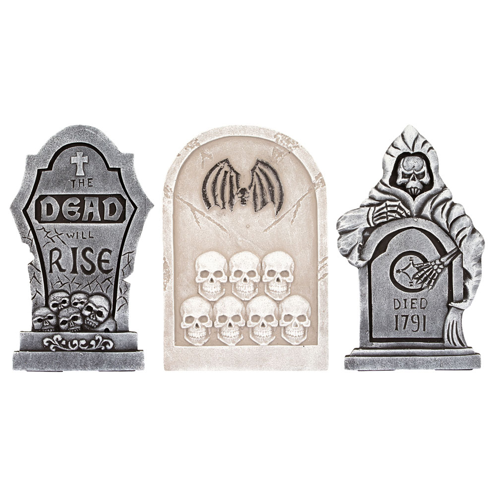 Gravsten Dekoration omfattar en läskig gravsten av frigolit som är ca 56 cm stor. Gravsten finns i tre olika varianter med olika texter och motiv. Vilken variant du får slumpas.